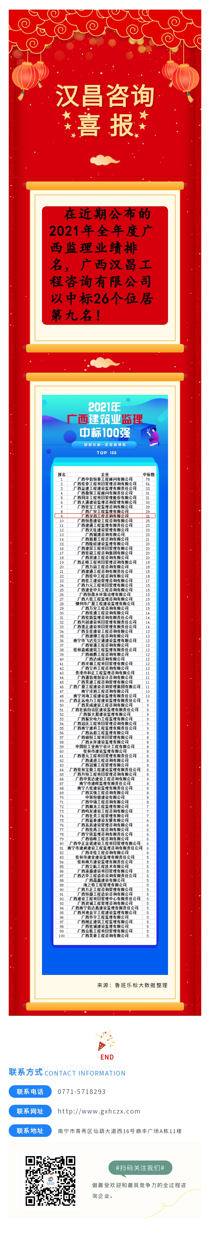 喜讯| 汉昌咨询在2021年全年度广西监理业绩居第九名!